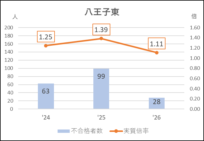 八王子東は前年度に倍率アップした反動もありましたが,ここまで少ない不合格者数と低い実質倍率になったことは近年ではありません。応募者が減っても受検棄権率は6.4→6.8→7.8%と高いままなので私立高に流れていると考えられます。もともと高倍率になりにくい地域にあり,重点校の中では倍率は低い方でしたが,それにしても今年度の入試状況は八王子東にしては異例といえるでしょう。