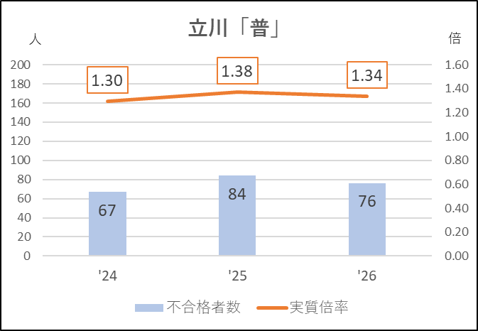 その一方で立川「普」は安定した入試が続いています。受検棄権率は8.2→7.5→6.8%と少しずつ下がってきており,第一志望者の応募が多いことを示しています。実質倍率は1.3倍台を維持し,不合格者も70人前後と大きな変動はありません。ここも私立志向の影響を受けているとはいえないようです。