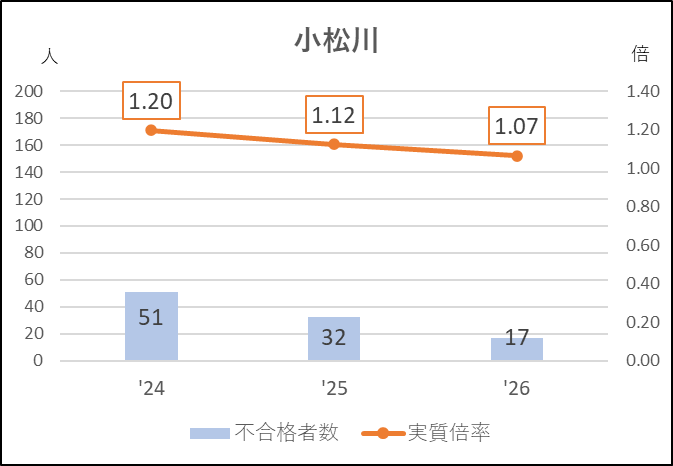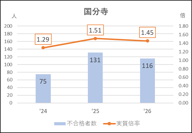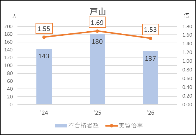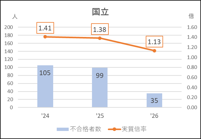 グラフの2025年度で,不合格者が減っているのに実質倍率が上がっているのは募集減になったからです。