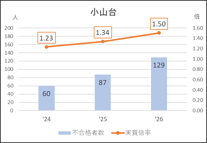 小山台は2年連続応募増で6年ぶりに400人を超えました(412人)。不合格者数は増加傾向で,実質倍率も1.5倍台にアップ,受検生の3分の1が不合格になる激戦でした。重点校の戸山をはじめ三田や竹早,小松川からの移動があるのかもしれません。
