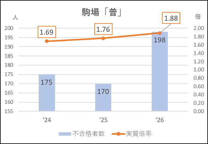 駒場「普」も応募者が増加し,不合格者が200人に迫っています。実質倍率も1.8倍台に上がり,近年でもっとも厳しい入試になりました。ただこの高倍率が引き金になったのか,受検棄権率は6.7→6.9→7.9%と増加しており,私立高への流れもみられました。