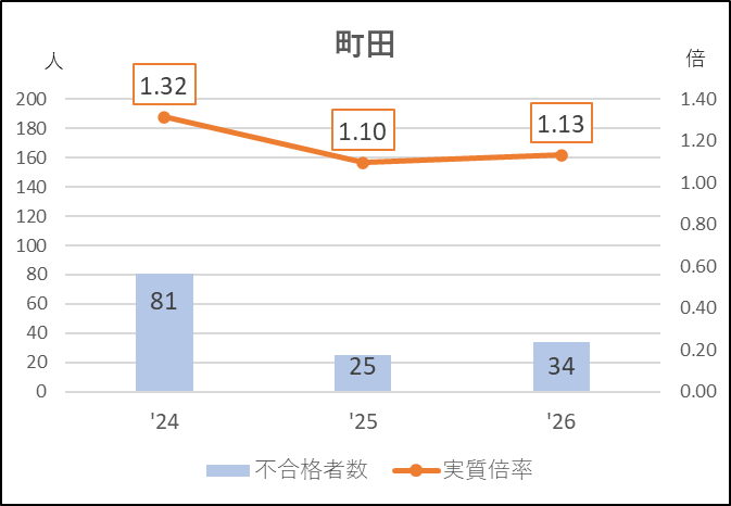 町田は前年度に63人の大幅な応募減になり,実質倍率が1.10倍に下がって不合格者の少ない緩やかな入試になりました。今年度はその反動が予想されていましたが,10人増でとどまり,実質倍率もほとんど上がりませんでした。駒場や日野台への移動のほか,八王子学園八王子や桜美林,麻布大学附属などの私学へも流れていると考えられます。