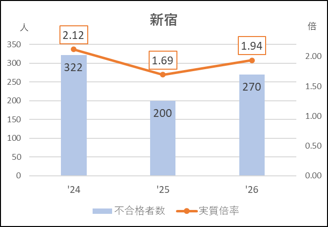 新宿は前年度入試で応募倍率が4年ぶりに1倍台(1.96倍)に下がり,実質倍率も1.6倍台まで落ち込みました。新宿としては比較的緩和された入試だったといえます。そのため,毎年高倍率になる人気校でさえ私立志向の影響を受けたと注目されました。しかし今年度は応募者が78人増え,不合格者も70人増加し,実質倍率も1.9倍台まで上昇しています。私立志向の高まりの中,今後も倍率の変動が大きくなる可能性があります。