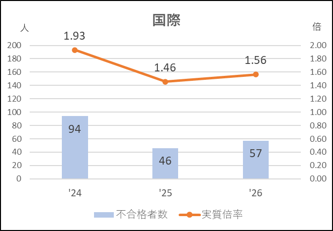 国際は私立志向の影響を強く受けている学校といえます。もともと高倍率にはなるものの,受検棄権率が高く,私立高との併願者が多く応募している学校でした。それが前年度入試で56人の応募減になり倍率が急降下,不合格者は半減し実質倍率は近年にない1.4倍台まで落ち込みました。今年度は応募者は増加したものの18人増でとどまり,しかも受検棄権率が19%から21%にアップ,不合格者は50人台,実質倍率も1.5倍台と国際にしては緩やかな入試が続いています。