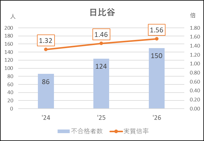 重点校の多くが応募減になる中で,日比谷は逆に増加傾向になっています。受検棄権率も22.9→21.9→19.2%と下がってきており,第一志望者の割合も増えているようです。これらの結果,グラフにあるように実質倍率は上昇し不合格者数も増え,今年度は受検生の3分の1が涙を呑む激戦でした。