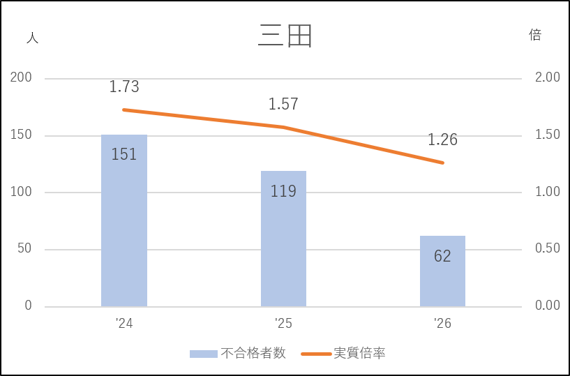 三田は応募者が減少傾向(393→354→343人)で、しかも受検棄権率も8.7→7.6→12.2%と大幅に上がりました。その結果、実質倍率は1.2倍台に落ち込み、不合格者も半減しています。受検棄権率が上がったことから、私立高へ流出したといえますが、2024年度入試より都立高の入試制度が男女別募集から男女合同募集になったことで女子の入学生が増えており、それも応募減の一因になっているのかもしれません。