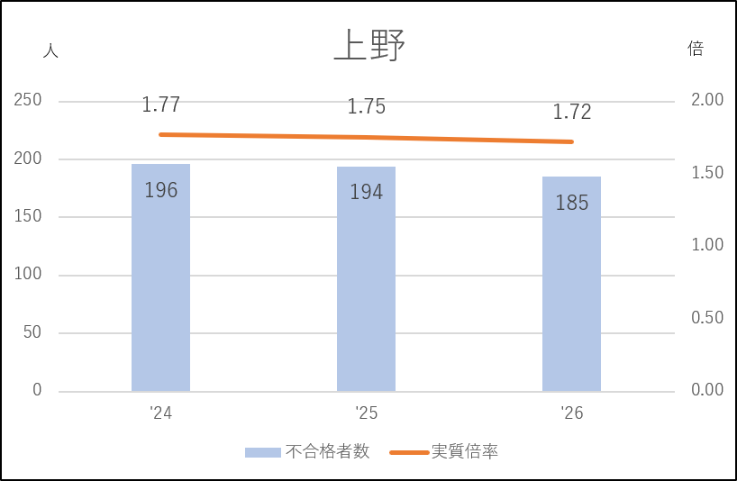 上野は高い人気を維持しており、実質倍率は1.7倍台で安定しています。不合格者数も増減は小幅で、受検生の4割以上が不合格になる激戦が続いており、私立志向の影響はあまり受けていないようにみえます。