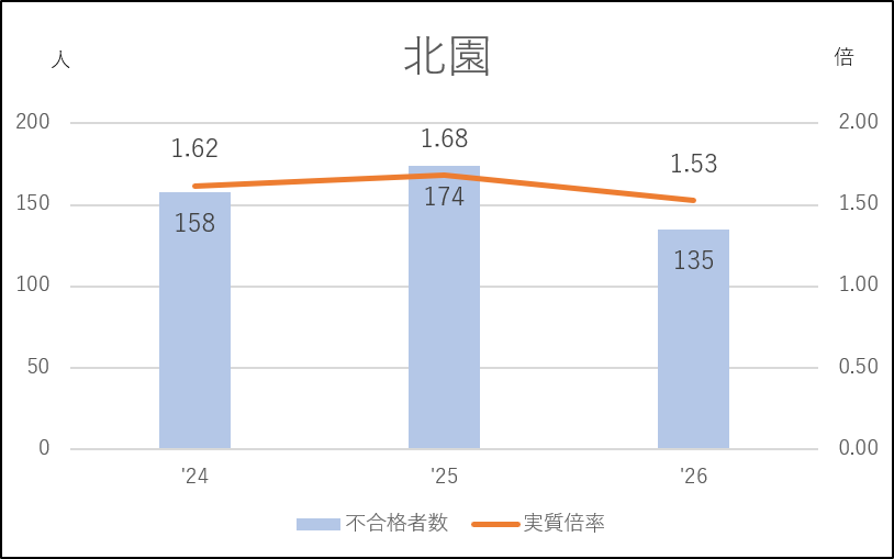 北園は44人の応募減(465→421人)となり、実質倍率は1.5倍台にダウン。不合格者も減りました。北園としては低い実質倍率と少ない不合格者です。受検棄権率は8.0→7.5→7.1%と少しずつ下がっているようですが高い水準が続いており、私立高への流出は続いているといえるでしょう。