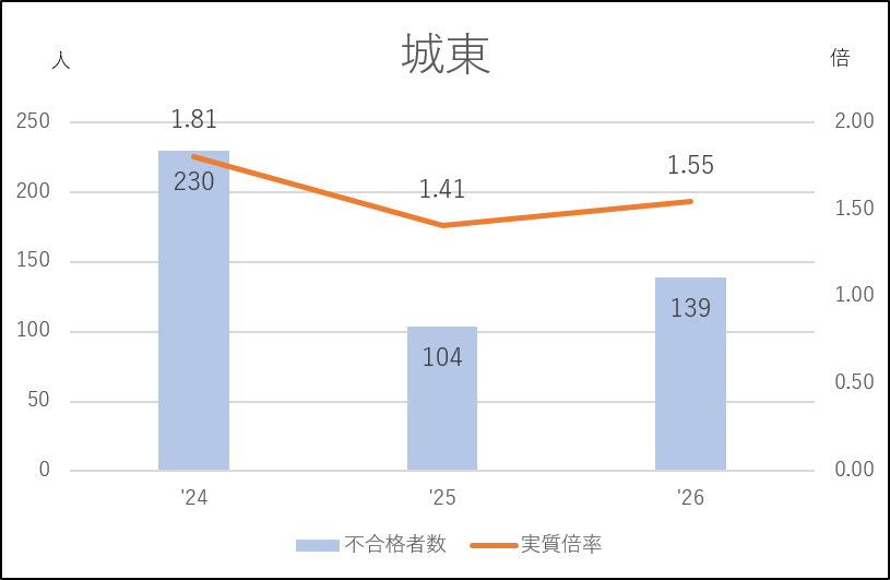 城東は人気の高い学校で、2024年度は実質倍率1.8倍台に上がり、不合格者は230人と受検者の45%を占める激戦でした。その翌2025年度は反動と私立志向によって168人の大幅な応募減(542→374人)。不合格者は半減し、実質倍率も3年ぶりに1.4倍台に落ち込みました。そして今年度はその反動で応募者は39人増、実質倍率も1.5倍台に上がっています。とはいえ、この実質倍率は城東としては低い方なので、私立志向の影響を受け続けているといえるかもしれません。
