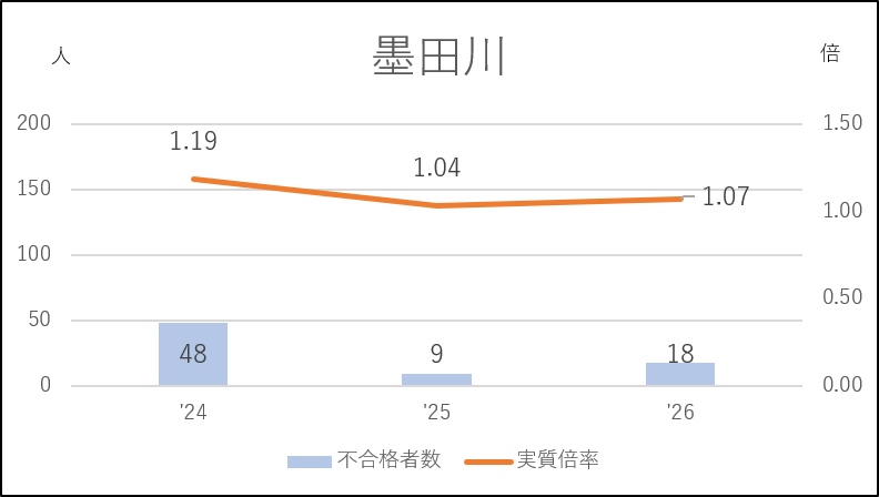 墨田川は低倍率入試が続きました。応募者は18人増えたものの不合格者が9人増で留まったのは受検棄権率が上がったからです(5.0→7.4%)。7%台の棄権率は6年ぶりで、この上昇は私立志向の高まりを示しています。