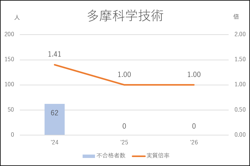 多摩科学技術は私立志向の影響を強く受けている学校です。前年度より応募者が減り(252→213→209人)、しかも棄権率も急激にアップ(14.7→28.2→26.8%)しました。その結果、2年連続で受検生全員が合格する全入の状態になっています。