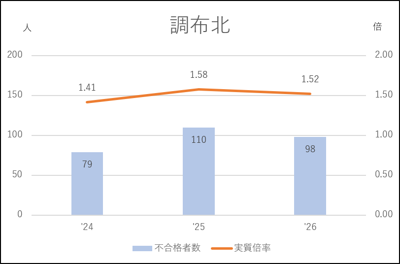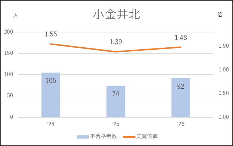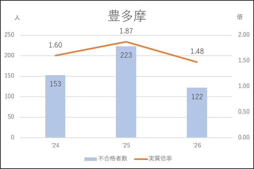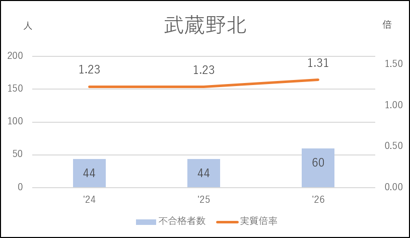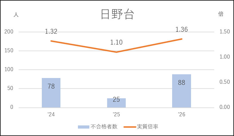 日野台は前年度に私立志向の影響を受け46人の応募減(335→289人)となり、実質倍率は1.10倍にダウン。不合格者の少ない近年でもっとも緩やかな入試になりました。その反動で今年度は64人の応募増となり、実質倍率も1.3倍台を回復しています。日野台としては例年の入試状況に戻った形です。