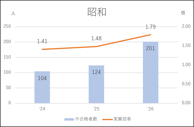 昭和も人気の高い学校ですが、2024年度は応募者が99人の大幅減(478→379人)になり、実質倍率が1.4倍台にダウン。昭和としては緩やかな入試でした。しかしその翌年から応募者は増加に転じ、今年度の不合格者は200人を超え、受検生の4割強が涙を呑む激戦になりました。このように私立志向が高まる中でも人気が衰えることはありませんでした。