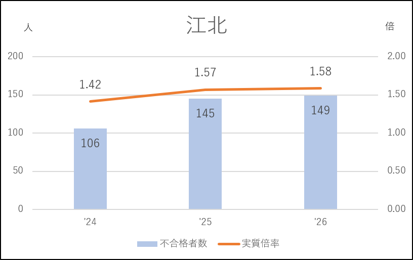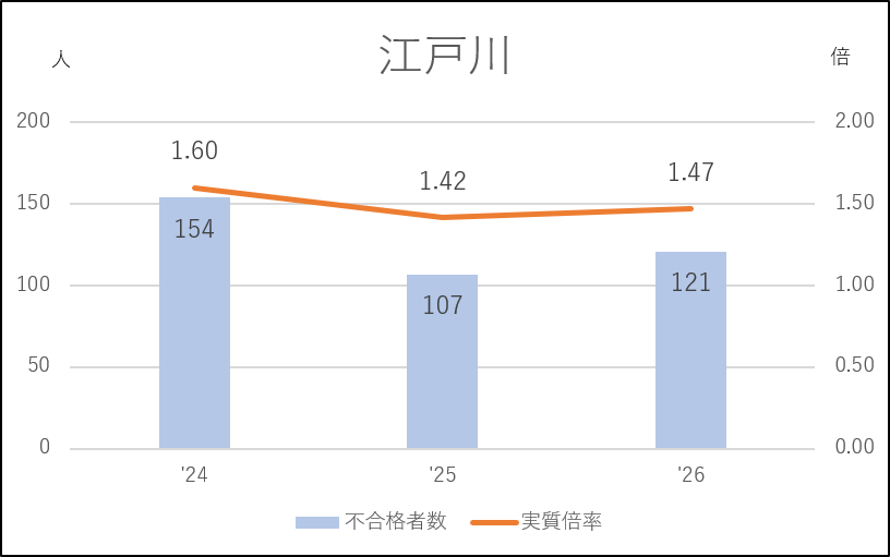 江戸川も2024年度に受検生の約4割が不合格になる激戦になり、翌2025年度は61人の応募減(433→372人)で実質倍率は1.4倍台にダウン。そして2026年度はまた応募増になり、不合格者が増加しました。しかし江戸川としては低い方の実質倍率で留まっており、城東と同じ動きで私立志向の影響を受けているといえます。