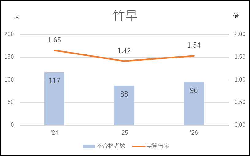 竹早は不合格者が増えて実質倍率も上がり、前年度よりやや厳しい入試になりました。しかし、応募者数は293人で前年度より27人減っています。倍率が上がったのは前年度の増学級が元の6学級募集に戻ったためです。従って2025年度以降、私立志向の影響を受け続けているといえるでしょう。